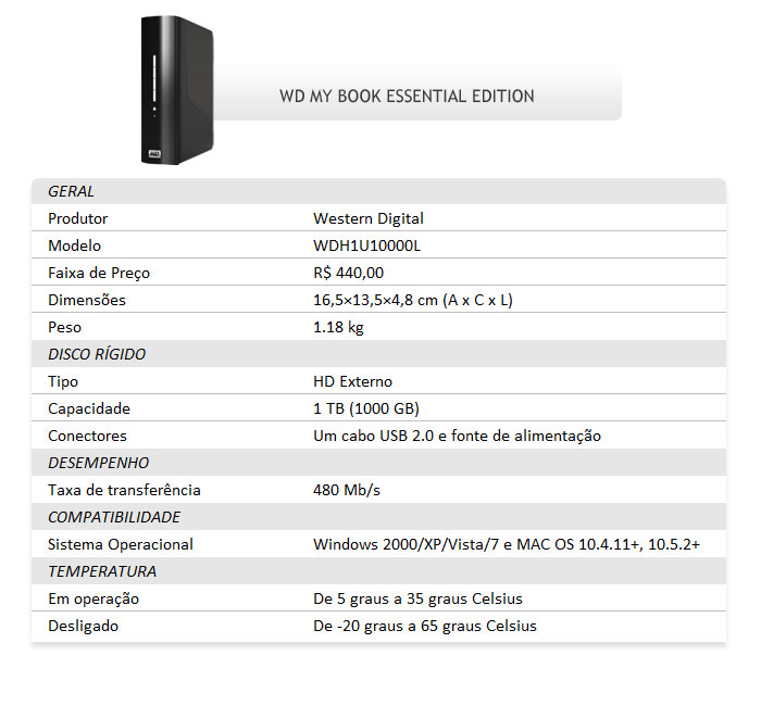 O WD My Book Essential Edition é mais voltado para usuário e empresas com grande volume de arquivos que precisam de um HD para a realização de backups. Apesar de ser externo ao computador, o disco rígido da Western Digital não é exatamente portátil.