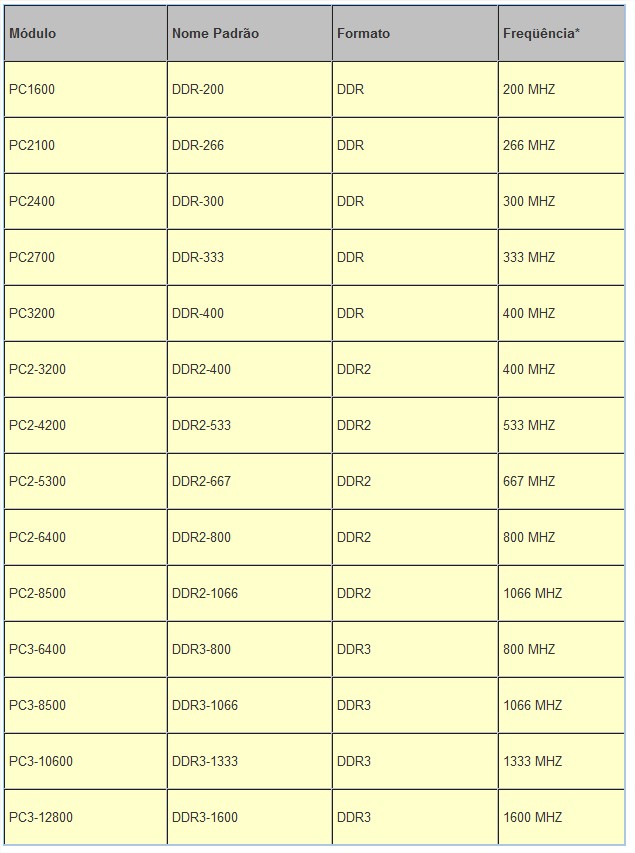 Nós já cobrimos um pouco do caminho dos dados pelo computador, então vamos aos tipos de pentes que encontramos no mercado ou que já existiram e deixaram de ser vendidos. Vale lembrar que os equipamentos e processadores mais recentes trabalham com memórias do tipo DDR2 ou DDR (para alguns dos anos anteriores). E para descobrir qual é o tipo de memória utilizada pelo seu computador, siga diretamente para o manual de instruções.