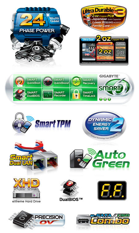 Abaixo alguns selos que caracterizam as “tecnologias” exclusivas da empresa que são suportadas pelo modelo GA-P55-UD6. Para conferir um release da Gigabyte sobre essa placa e sobre essas tecnologias clique aqui.