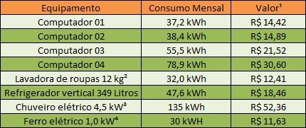 Agora que já sabemos a média de consumo mensal de cada um dos nossos exemplos, vamos compará-la com a média de consumo de alguns produtos eletrônicos que também possuímos em casa.
