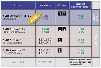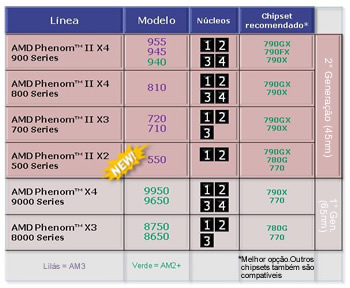 O portfólio atualizado para o segundo semestre desse ano de processadores Phenom e Athlon pode ver-se no gráfico que acompanha esta notícia; pode perceber-se que estamos num processo de transição no qual ainda convivem produtos da primeira geração com os novos modelos do Athlon II e do Phenom II, processo de atualização tecnológica que deverá encerrar no final do ano.