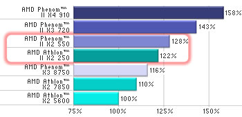Segundo os técnicos da AMD, após realizarem uma série de testes comparativos da performance relacionados com mídia e suporte digital, os micros Athlon II X2 250, obtém vantagem significativa respeito dos X2 anteriores, inclusive dos modelos relativamente novos como o X2 7750, reduzindo conseqüentemente, o consumo.