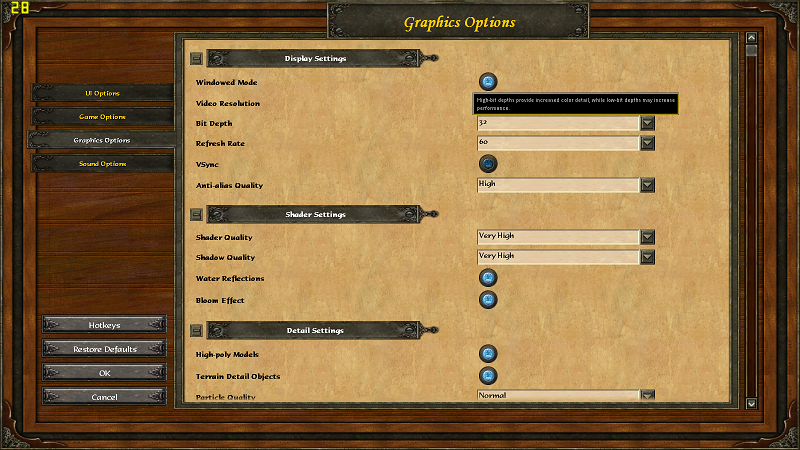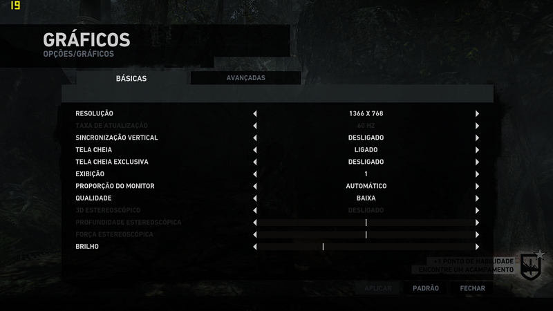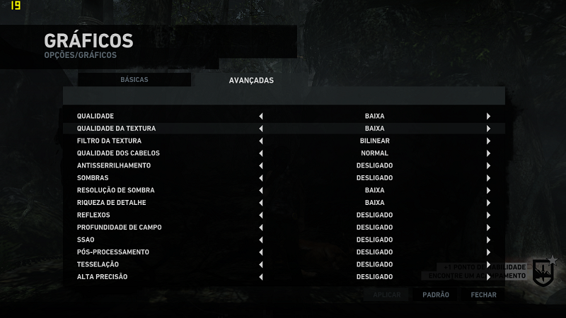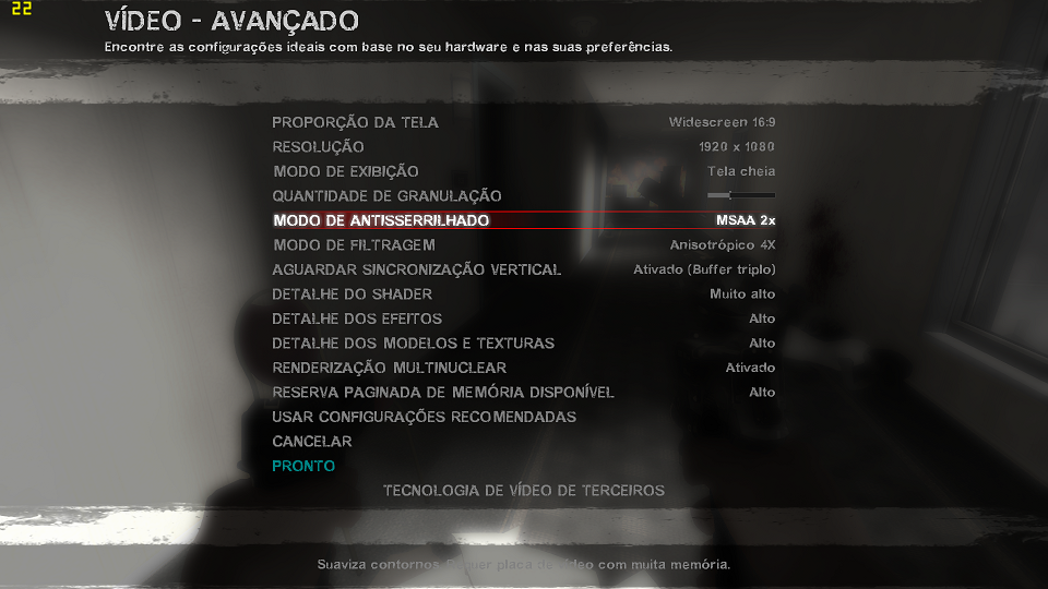 Por ser um game com composição de muitos elementos e exigir um pouco mais de processamento, as configurações utilizadas foram as seguintes:
